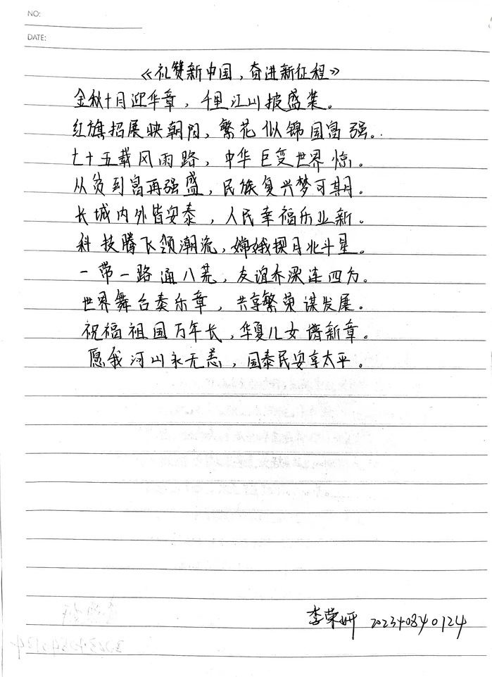 2024年10月16日,为庆祝新中国成立75周年,U8国际举办了以“礼赞新中国,奋进新征程”为主题的征文活动。此次活动吸引了五十名同学的积极参与,他们用文字表达了对祖国的热爱与赞美,展现了新时代的奋斗精神。