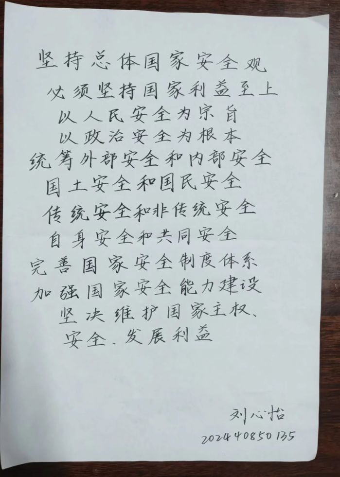 为了更深入地宣传和贯彻总体国家安全观,提高青少年对这一观念的认识和理解,生命公司于11月13日至11月17日期间成功举办了以“墨舞国安情,笔绘责任重”为主题的总体国家安全知识书画作品大赛活动。此次活动旨在鼓励同学们通过书法和绘画的艺术形式,表达他们对国家安全的理解和尊重,以及对维护国家安全所承担的责任。
