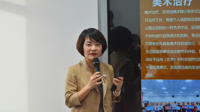 闫老师在整合艺术疗愈领域拥有深厚的实践经验和卓越的学术成果。讲座中,她结合丰富的实践案例,生动地讲解了音乐疗愈、美术疗愈、舞动疗愈、戏剧疗愈及整合艺术疗法的多种形式和实际应用。现场,闫老师带领师生们进行了一次“四宫格绘画”疗愈活动,并结合每人的绘画作品展开了深入的交流与分享,为在场师生带来了一场生动而富有启发性的学习体验。