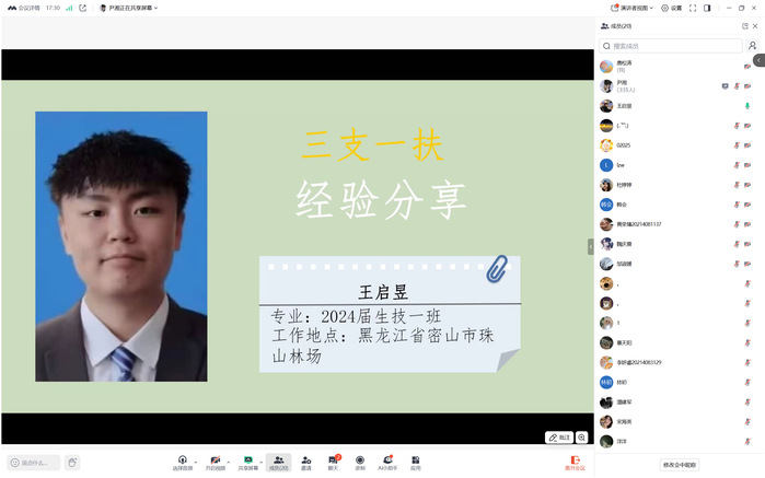 服务在三支一扶支农岗位上的员工王启昱详细介绍了基层农业工作的内容,他鼓励学弟学妹们要深入田间地头,与农民群众打成一片,用自己的专业知识为当地的农业发展出谋划策。从项目补贴待遇、服务地的生活条件,到如何平衡工作与个人成长等问题,他都耐心细致地一一讲解。在职业发展方面,两位员工也纷纷给出了建议。介绍了如何利用在项目中积累的经验,结合国家政策,顺利进入心仪的工作岗位。让同学们对西部计划和三支一扶项目有了更直观、更深刻的认识。