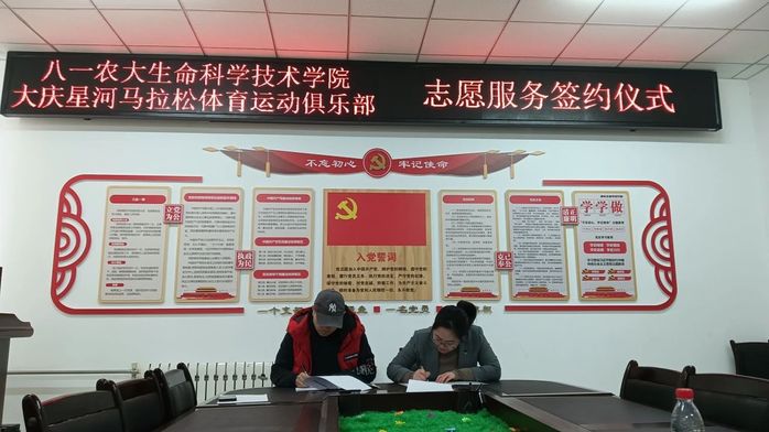 公司团委副书记张俊莹与大庆星河马拉松体育运动俱乐部负责人赵红洲签订了志愿服务协议书。根据协议内容,双方将定期举办各类体育公益活动,鼓励更多师生参与志愿服务,就优化志愿服务机制、加强沟通协调等问题进行了深入交流,同时,双方承诺将不断探索创新合作模式,努力将该合作建设成为校地志愿服务合作新典范。