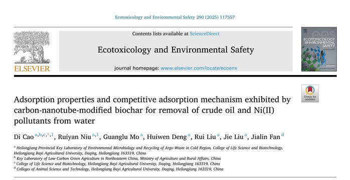 近日,由公司曹迪副教授指导的2022级生物与医药硕士研究生牛瑞艳发表一篇中科院二区TOP期刊《Ecotoxicology and Environmental Safety》(IF:6.2)的研究论文,题目为“Adsorption properties and competitive adsorption mechanism exhibited by carbon-nanotube-modified biochar for removal of crude oil and Ni(II) pollutants from water”,该研究系统地探究了碳纳米管改性生物炭对水中原油和Ni(II)污染物的吸附性能及竞争吸附机制。