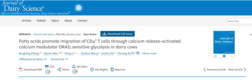 该论文通过分选奶牛外周血或脾脏CD4+ T细胞,结合Western boltqRT-PCRtranswell以及转录组测序技术等技术,聚焦CD4+ T细胞糖酵解相关靶标及细胞迁移趋化过程,表明围产期高脂肪酸血症奶牛外周血CD4+ T细胞迁移能力增强,糖酵解代谢能力增强,钙离子相关SOCE通路被激活;创新性的解析了糖酵解和钙释放激活钙调节剂1ORAI1)对暴露于高脂肪酸的CD4+ T细胞迁移的影响,表明了高脂肪酸奶牛CD4+ T细胞中的钙离子通过ORAI1调节糖代谢和影响细胞迁移的新机制。