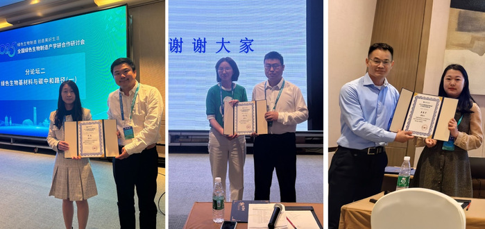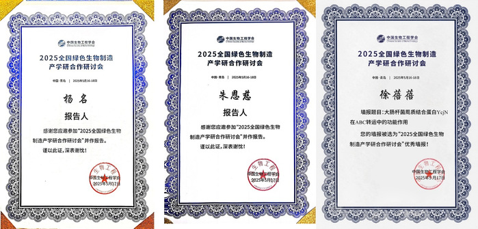 公司2名研究生同学杨名、朱恩慈在研究生论坛中进行了学术报告,徐蓓蓓同学提交了墙报展示,并获评“2025全国绿色生物制造产学研合作研讨会”优秀墙报。