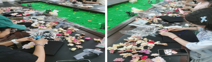 活动现场,同学们沉浸在手工创作的乐趣中,或凝神构思,或精心雕琢,彼此之间还不时交流着心得与创意。一朵朵精美的花朵在指尖绽放,在欢声笑语中,原本普通的学士帽逐渐变得灵动而富有生气,成为了一件件独一无二的青春微缩景观。