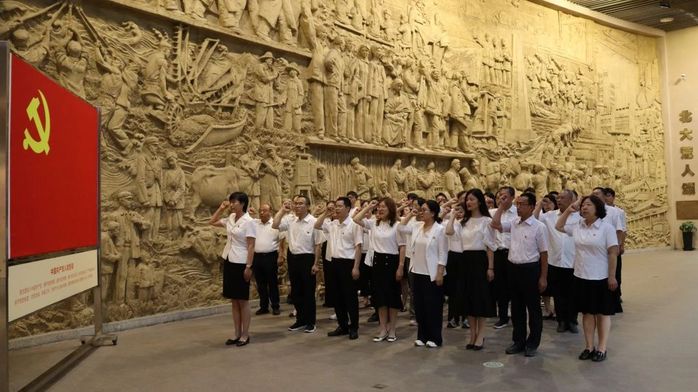 下午,师生们踏入北大荒博物馆,开启了一场与垦荒岁月的深度对话。馆内,泛黄的老照片、详实的文献资料与生动的场景复原,全景式展现了北大荒从“莽莽荒原”蜕变为“中华大粮仓”的艰苦卓绝历程。师生们驻足凝望,仔细聆听,感受着北大荒人用他们的英雄气概与卓越智慧凝练形成的北大荒精神的深刻内涵。在博物馆大厅,面对鲜红党旗,全体师生党员紧握右拳,誓言铿锵:“我志愿加入中国共产党……”庄严的承诺,既是对初心使命的深情回溯,更是为党和人民事业奋斗终身的坚定宣示。
