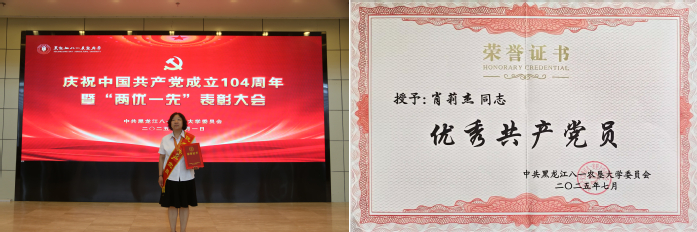 肖莉杰同志政治立场坚定,坚持不断地学习党的方针政策。她刻苦钻研业务知识,承担了多门课程的教学工作,深受同学们喜爱。她不计个人得失,在教研室出现突发情况时不顾自己属于高龄产妇且处于哺乳期,提前结束产假,克服身体的病痛坚持高质量地完成了繁重的教学任务。她关爱员工,以人为本,从诚实、平等、尊重的角度出发,以高尚的道德情操和良好的师德修养去关爱他们。她出资一万多元资助特困员工住院治疗,并连夜守候在手术室门口直到员工脱离危险。她热爱集体,无私奉献,先后承担了工会委员、教学督导、支部宣传委员、组织委员和党支部书记的工作,尽职尽责,先后获得校优秀工会积极分子和校优秀共产党员荣誉称号。