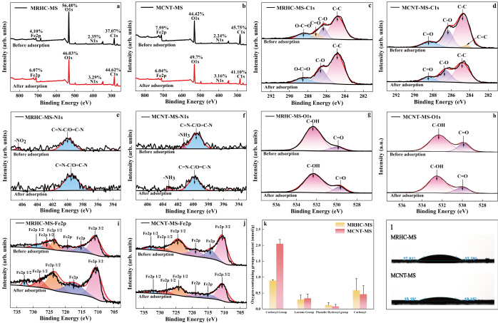 Fig. 3. The XPS results of the two types of magnetic microspheres: (a-b) total spectra and (c-d) C1s spectra, (e-f) N1s spectra, (g-h) O1s spectra, (i-j) Fe2p spectra, (k)surface oxygen functional group content and (l) Contact angle test results.
