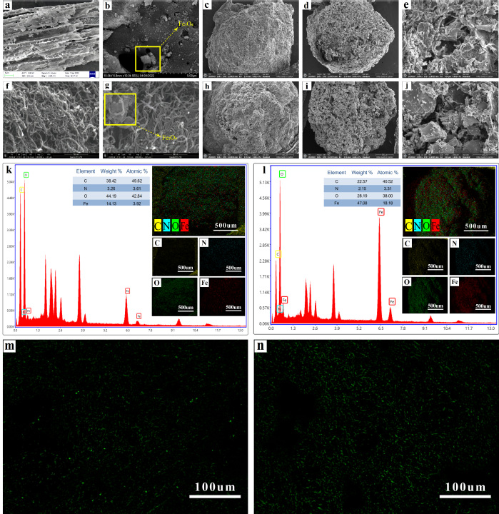 Fig. 1. Characterization of magnetic beads and fluorescence staining of LD23 bacteria in: (a, b) MRHC, (ce) MRHC-MS, (f, g) MCNT, (hj) MCNT-MS, (k,m) MRHCMS and (l,n) MCNT-MS.