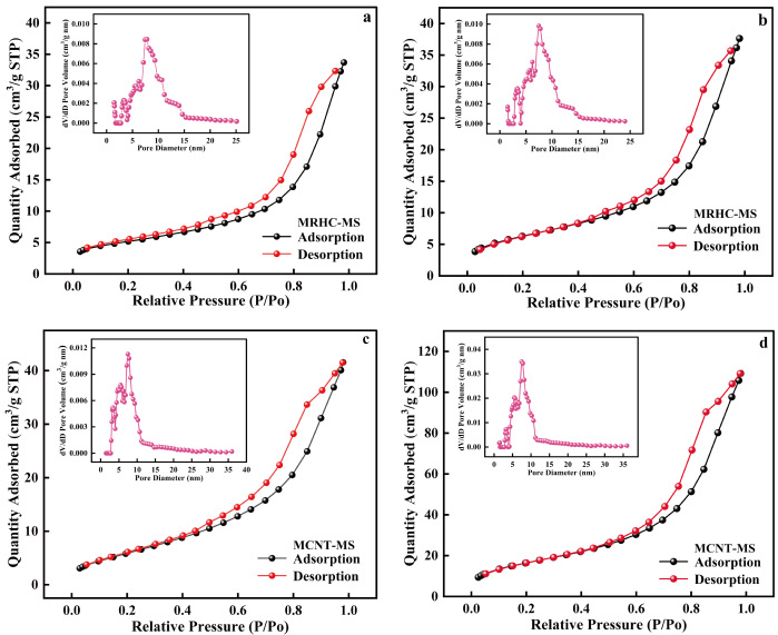 Fig. 2. The N2 adsorption desorption isotherms and pore size distribution of the two types of microspheres: (a) MRHC-MS without bacterial embedding, (b) MRHCMS with bacterial embedding, (c) MCNT-MS without bacterial embedding, and (d) MCNT-MS with bacterial embedding