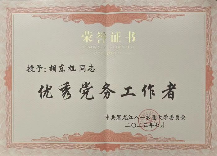 胡东旭同志自从事党务工作以来,以高度的政治责任感投身党务工作。指导公司员工第二党支部开展党建共建活动,组织员工党员参观“三老四严”传统教育展厅、北大荒博物馆、铁人王进喜纪念馆、参加社区服务等实践项目80余次,支部党员参与WCBA常规赛、马拉松比赛、劳动实践等多种志愿服务活动。近3年指导公司发展员工党员99名,开设“榜样的力量”“研言驿站”等老员工党员先进事迹报告会活动,其中所指导的员工黄欣录制的党课成功入选2024年度大庆市“党课开讲啦”栏目,并荣获“优秀党课”荣誉称号。曾获得2023年U8国际辅导员职业能力大赛二等奖,发表党建相关文章2篇,主持校级党建课题1项,以实干担当彰显新时代党务工作者风采。