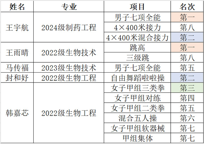 男子七项全能赛场上,2024级制药工程专业王宇航以绝对的实力脱颖而出,一举打破省记录、夺得金牌。他在多个项目中展现出了卓越的身体素质和竞技水平,无论是短跑的风驰电掣,还是跳远的轻盈矫健,每一个瞬间都彰显着全能风采。而2023级生物技术专业马传福同样不甘示弱,在激烈的竞争中斩获第五名,展现了生命公司学子坚韧不拔的精神。