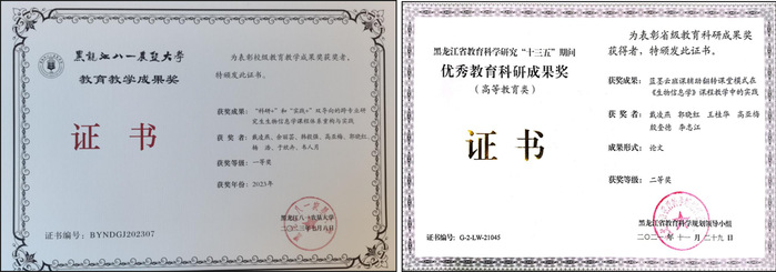 2. 2021年,主持“蓝墨云班课辅助翻转课堂模式在《生物信息学》课程教学中的实践”荣获黑龙江省教育科学研究“十三五”期间优秀教育科研成果(高等教育类)二等奖;